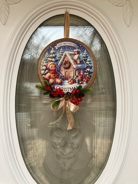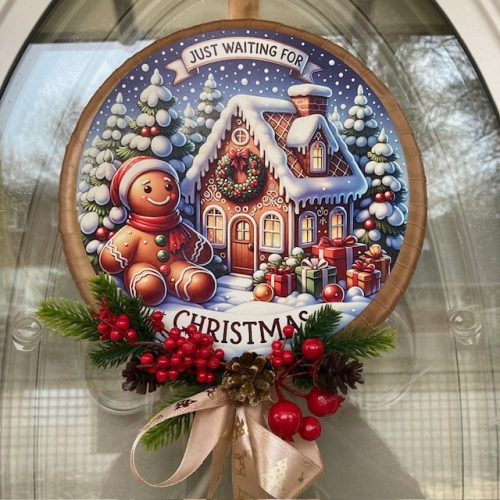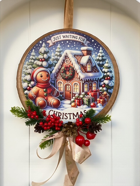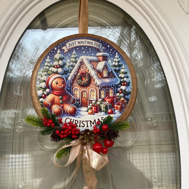 Bájos Karácsonyi ajtódísz mézivel, mézeskalács házzal, karácsonyi dekor ággal és selyem szalaggal díszítve. Méret: 25 cm plusz a szalag. Elkészítési idő 3-5 munkanap. Egyedi kézműves termék.