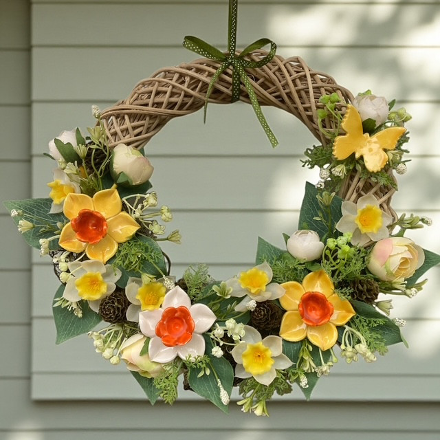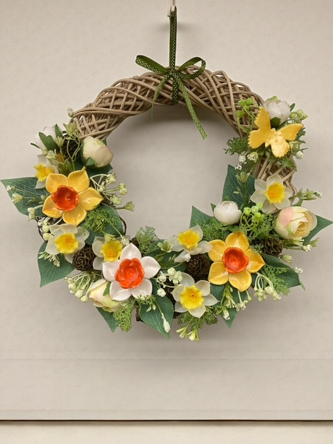 Ez a tavaszi kerámia nárciszos ajtódísz a megújulás és a frissesség hangulatát hozza el otthonodba.A 25 cm átmérőjű, természetes vessző alapra készült díszt 3 darab saját készítésű kézműves kerámia nárcisz és egy finom részletekkel kidolgozott kerámia pillangó teszi igazán különlegessé.A nárcisz a tavasz egyik legkedveltebb virága, a fényt és az új kezdeteket jelképezi, míg a pillangó a könnyedséget és az átalakulást idézi.Ez az ajtódísz tökéletes választás bejárati ajtóra, előszobába vagy fedett teraszra, ahol már az érkezés pillanatában barátságos, tavaszi hangulat fogad.Minden darab kézzel készült, aprólékos munkával, ezért enyhe eltérések előfordulhatnak – ettől válik igazán egyedivé.Időtálló, természetközeli dekoráció, amely évről évre örömmel kerül elő a tavaszi időszakban.