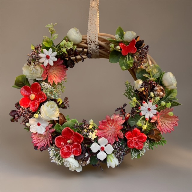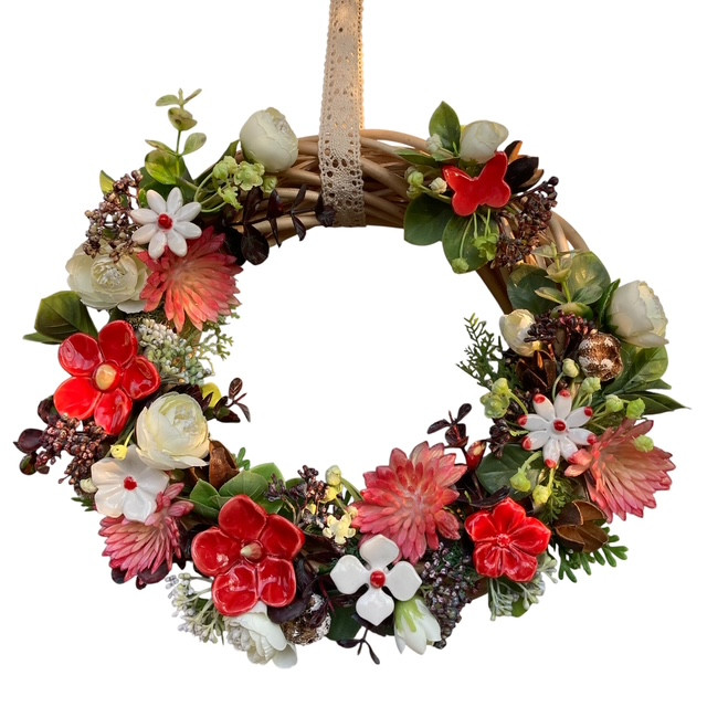 A természetes vessző alapra 7–8 darab részletgazdag kerámia virág kerül, harmonikusan összeállított mű dekorral. Tartós, időtálló dísz, amely nem csak egy szezonra szól.