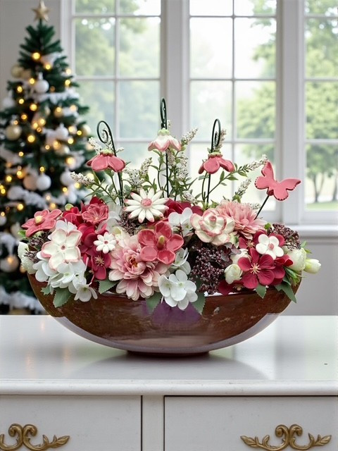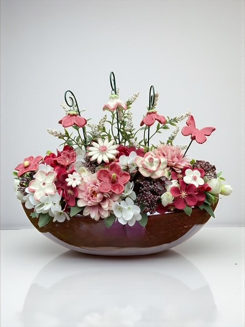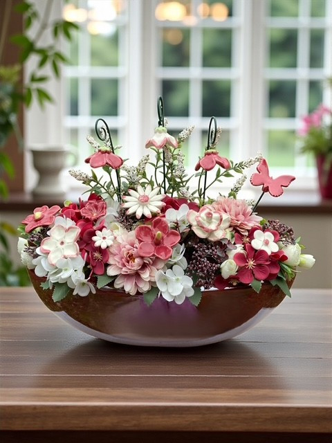 A kerámia virágokat prémium selyemvirágok, zöldek és aprólékos kiegészítők teszik teljessé, így egy gazdagon díszített, tartós és időtálló dekoráció született – egész évben a lakás éke lehet.