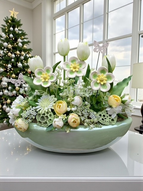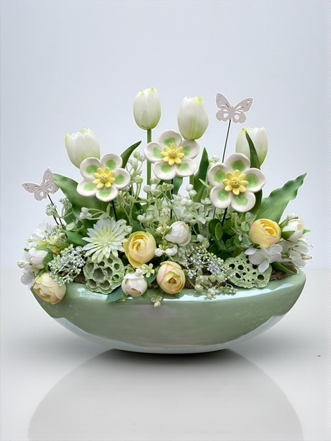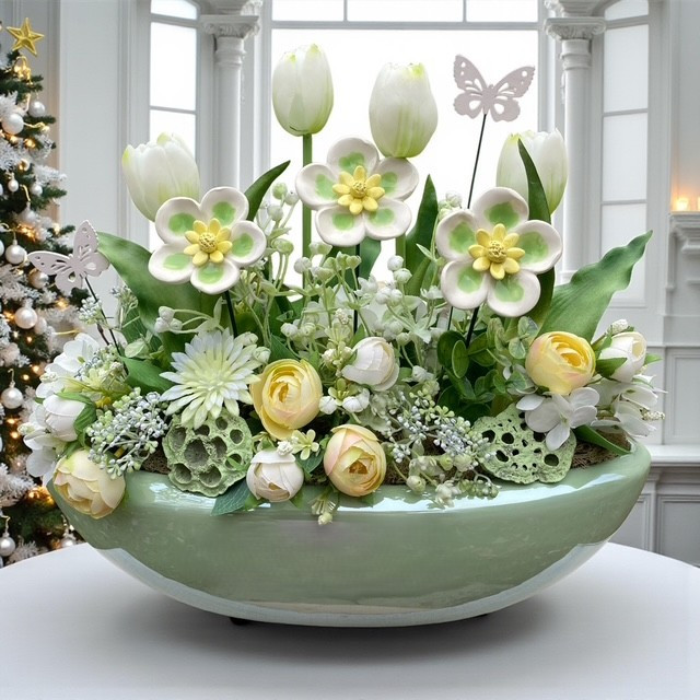 Elegáns, ünnepi hangulatú asztaldísz gyöngyházfényű kerámia kaspóban. A kompozícióban 3 db kézzel készült kerámia hunyor kapott helyet, melyeket prémium minőségű műnövények, bimbók, tulipánok,ágak és termések tesznek teljessé.