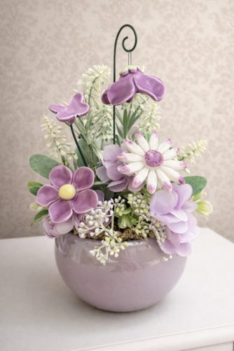 Asztaldísz lila kerámia virágokkal - lila nagy gömb kaspóban