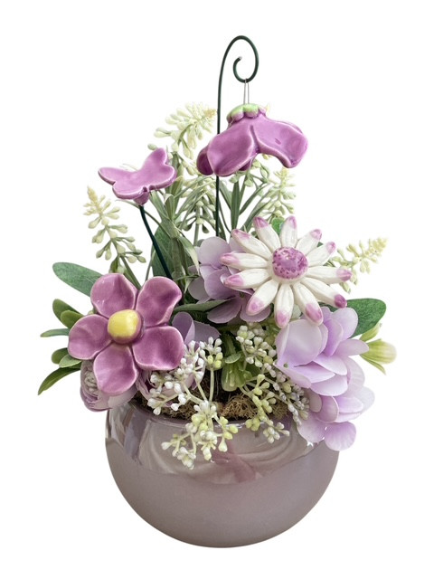 Elegáns tavaszi asztaldísz 3 db kerámia virággal és pillangóval, valamint műnövényekkel díszítve, különleges gyöngyház fényű gömb kaspóban. Élő növényeket nem tartalmaz. Kb. 25 cm magas. Kaspó mérete 13*9 cm.