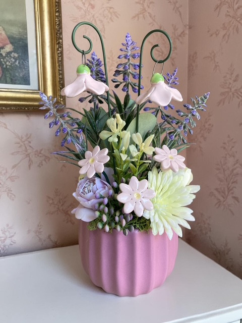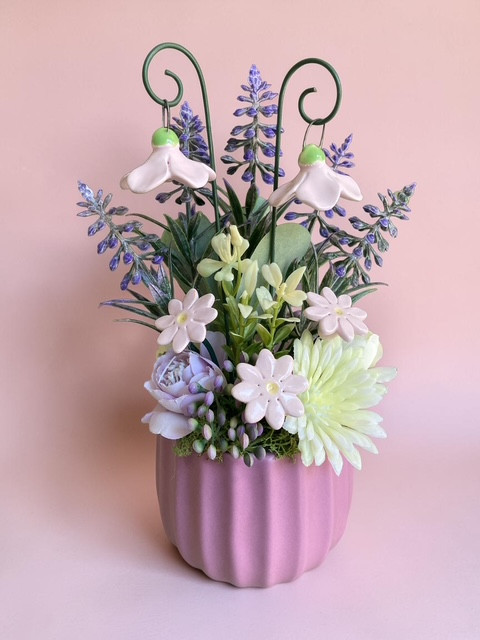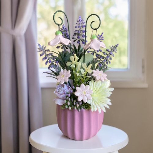 Elegáns tavaszi asztaldísz kerámiavirágokkal (3 db) és mini harangvirágokkal (2db), valamint műnövényekkel díszítve, rózsaszín kaspóban.