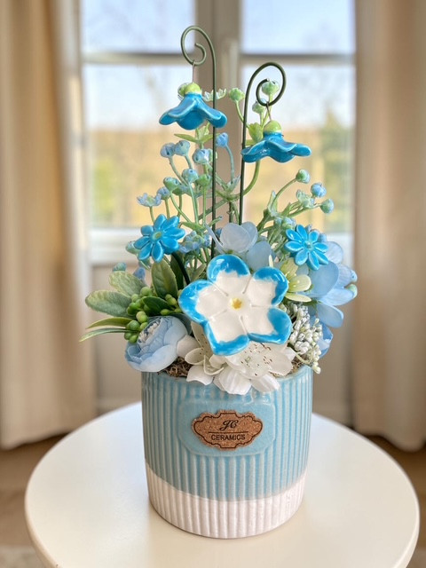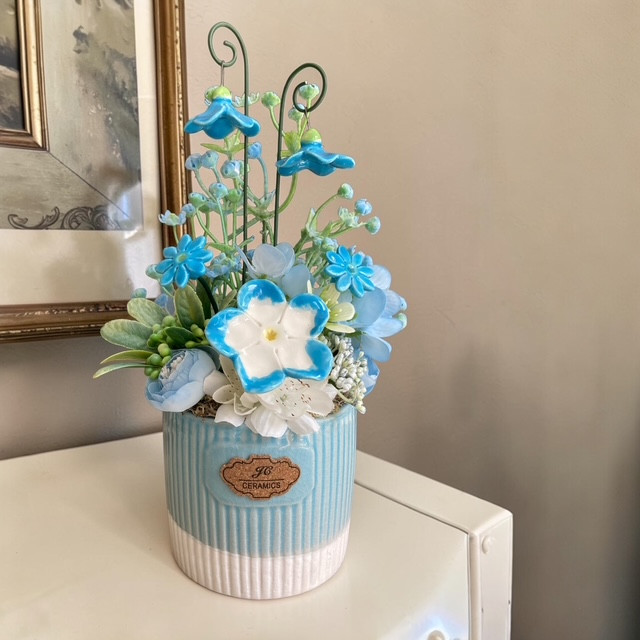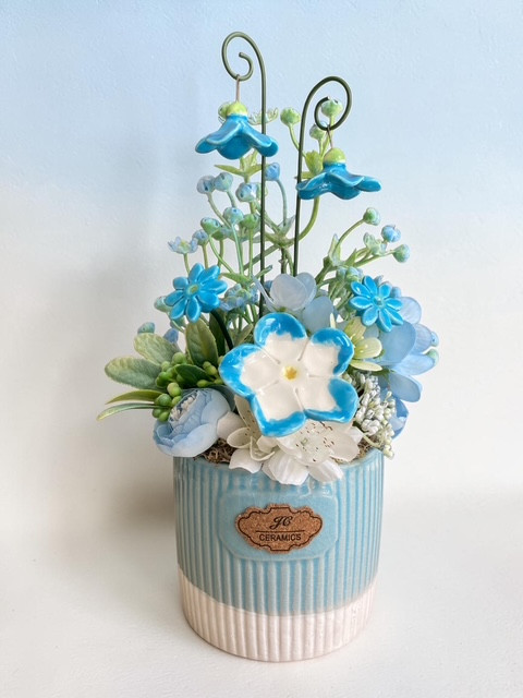 Elegáns tavaszi asztaldísz kerámiavirágokkal (3 db) és mini harangvirágokkal (2db), valamint műnövényekkel díszítve, kék kaspóban.