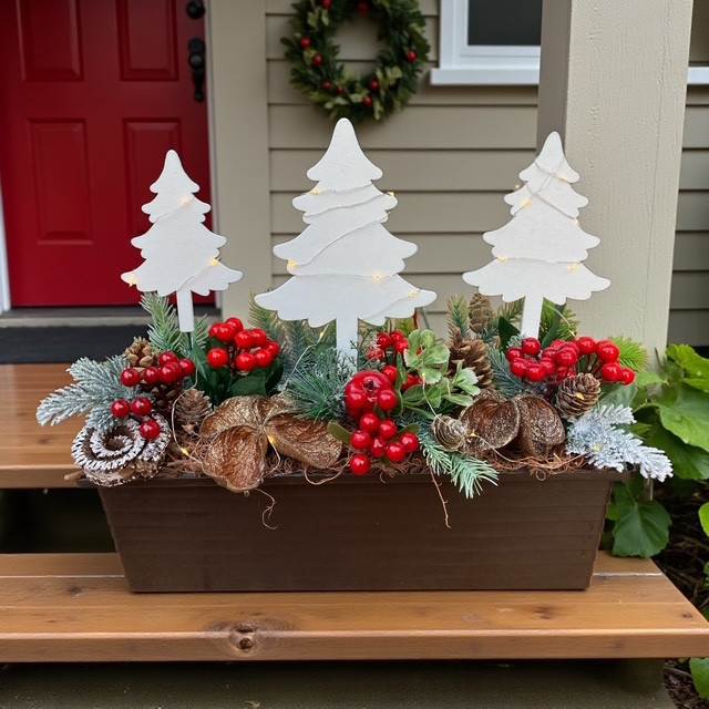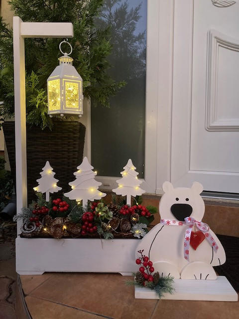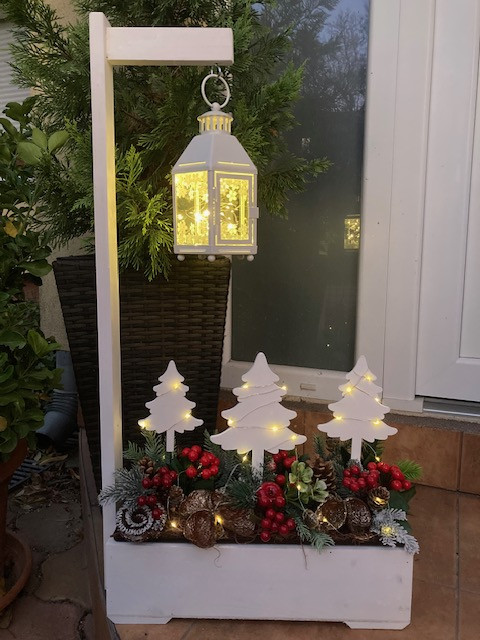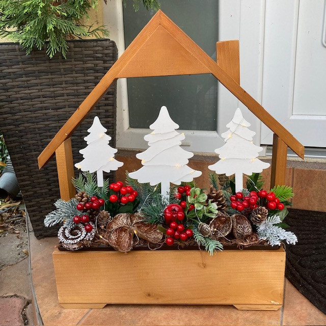 Karácsonyi virágláda betét művirágokkal, termésekkel, fehér fenyőkkel és LED világítással díszítve. A műanyag betét mérete 40 cm. Magasság kb 35 cm. A LED fényfűzér 2 db AA elemmel működik. Az elem nem része a csomagnak.
