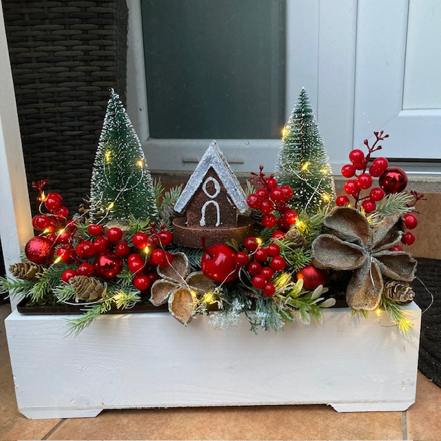 Bájos Karácsonyi virágláda betét Mézeskalács házikóval, fenyőfákkal, fenyőágakkal, termésekkel, piros bogyókkal, LED világítással díszítve. A műanyag betét mérete 40 cm. Magasság kb 35 cm. A LED fényfűzér 2 db AA elemmel működik. Az elem nem része a csomagnak. Lámpás virágládáinkhoz, téglalap aljú virágládához és virágtartó padhoz is kompatibilis. A virágláda nem része az árnak, azt külön meg kell vásárolni.