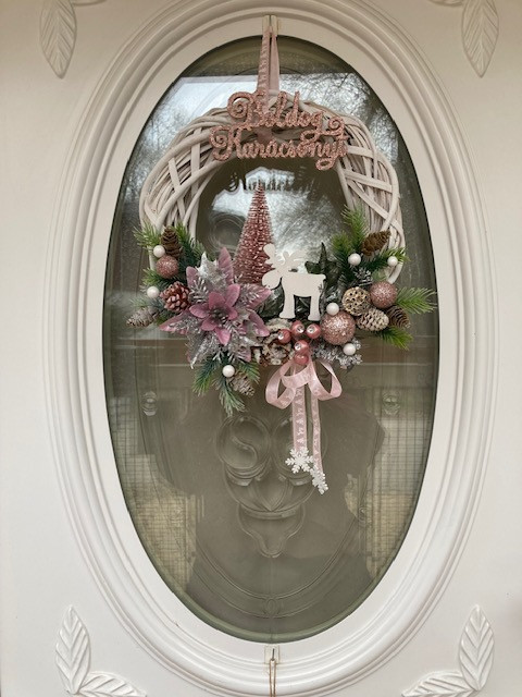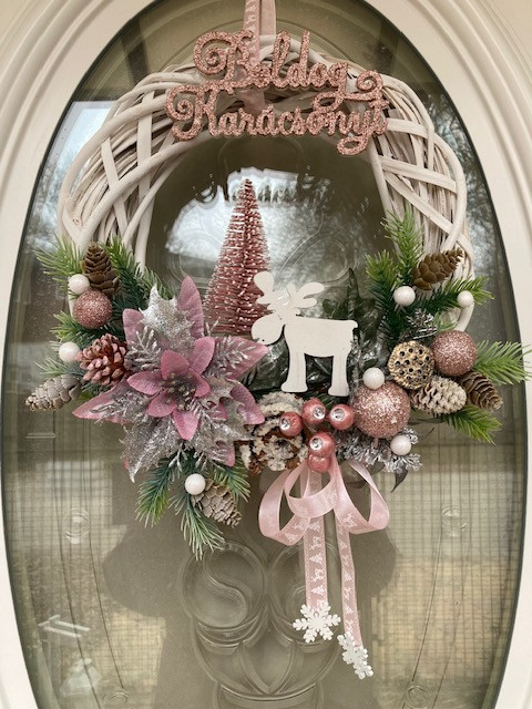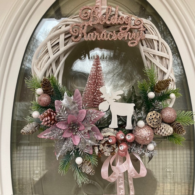 Elegáns Karácsonyi ajtódísz, bájos szarvassal, fenyővel, mikulásvirággal, fenyőágakkal, csillogó termésekkel, díszítve, 30 cm-es vessző koszorú alapon. Élő növényeket nem tartalmaz. Elkészítési idő 3-5 munkanap.