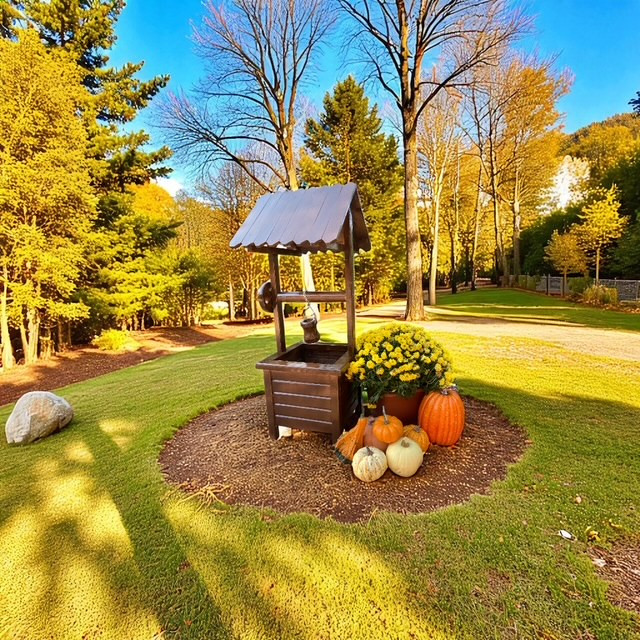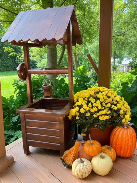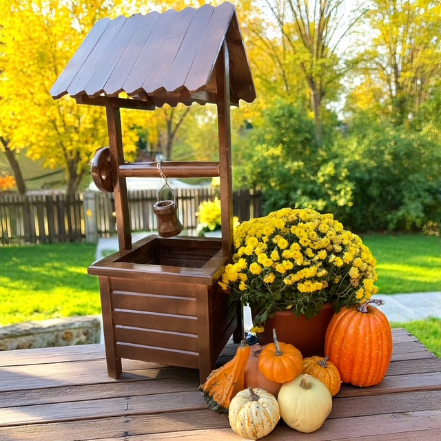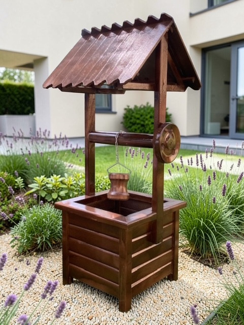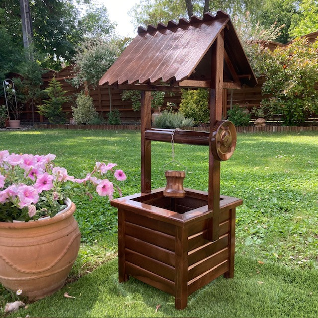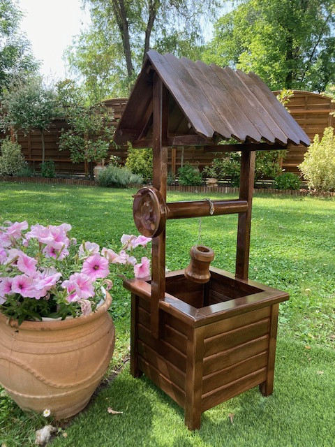 Fából készült dekoratív kerekes kút. 90 cm magas, 38*40 cm széles. Összeszerelve szállítjuk. Anyaga fenyő, lazúrral kezelve. Szín: sötét barna