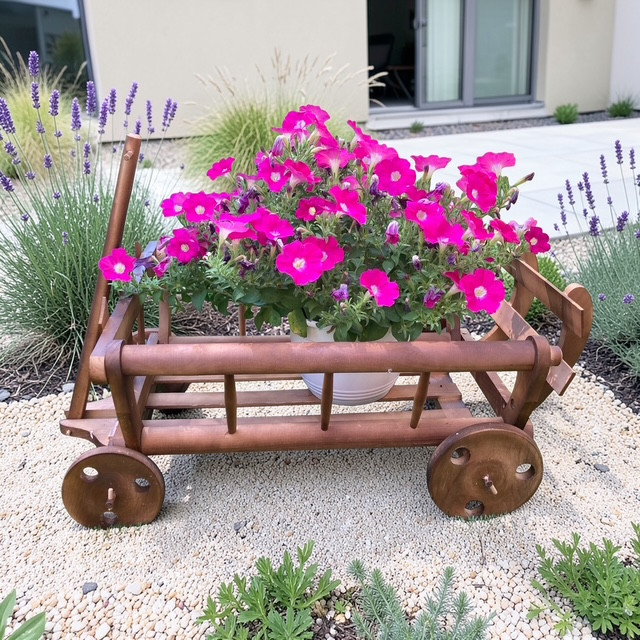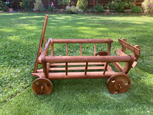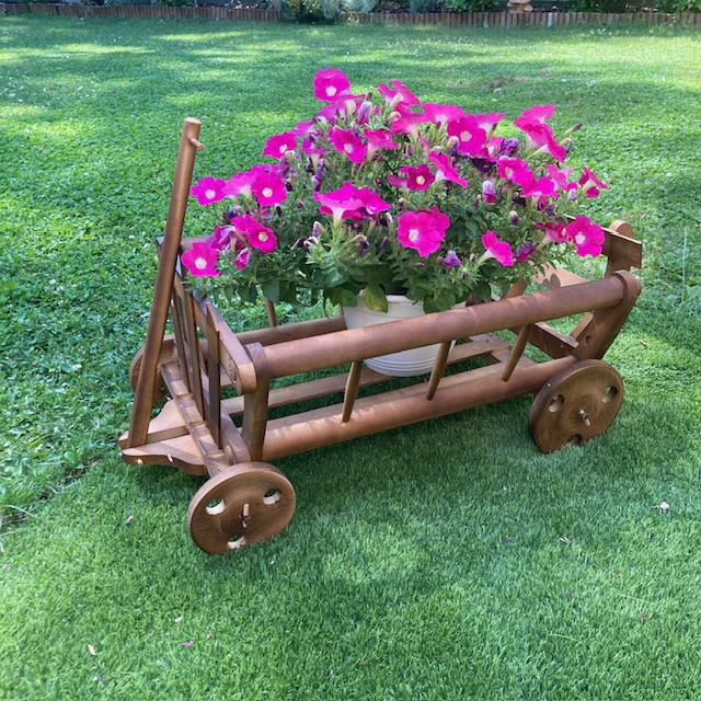 Dekoratív fa virágtartó szekér. Méret: 84*50 cm, 38 cm magas.Anyaga fa, lazúrral fújva.Összeszerelve szállítjuk. Szín: dió barna