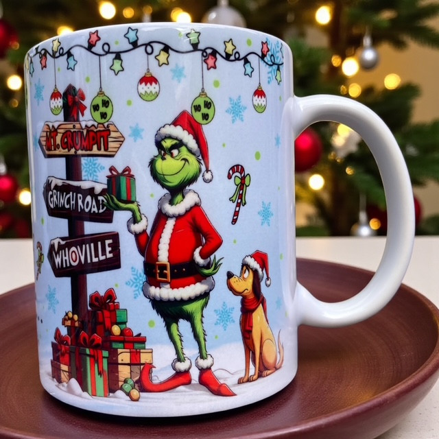 Vidám kerámia bögre Grincs és Max motívummal. Mindkét oldalán díszített. Méret 3 dl.