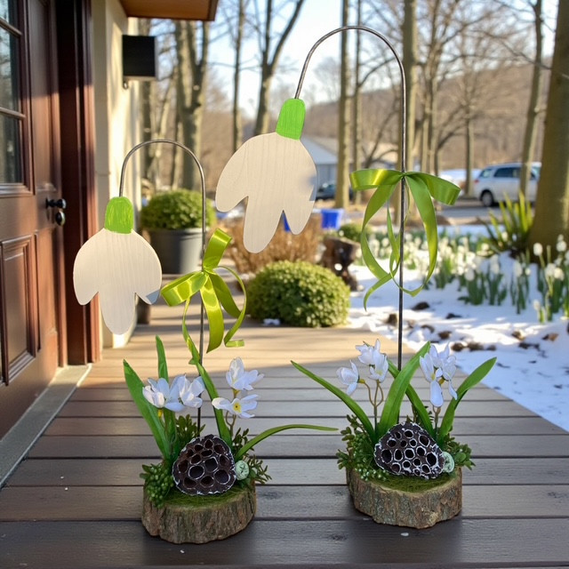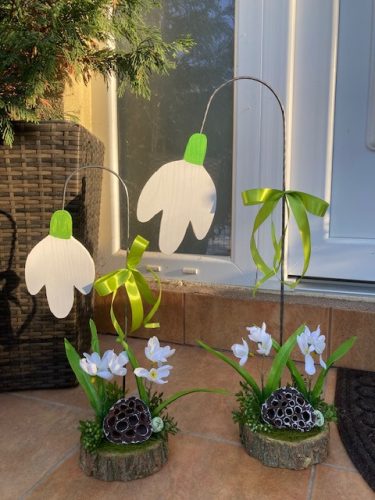 Fából készült hóvirág fém száron, dekorációval. Fa talpának köszönhetően stabilan áll. Kül és beltéren egyaránt használható. Teljes magasság kb. 40-50 cm.