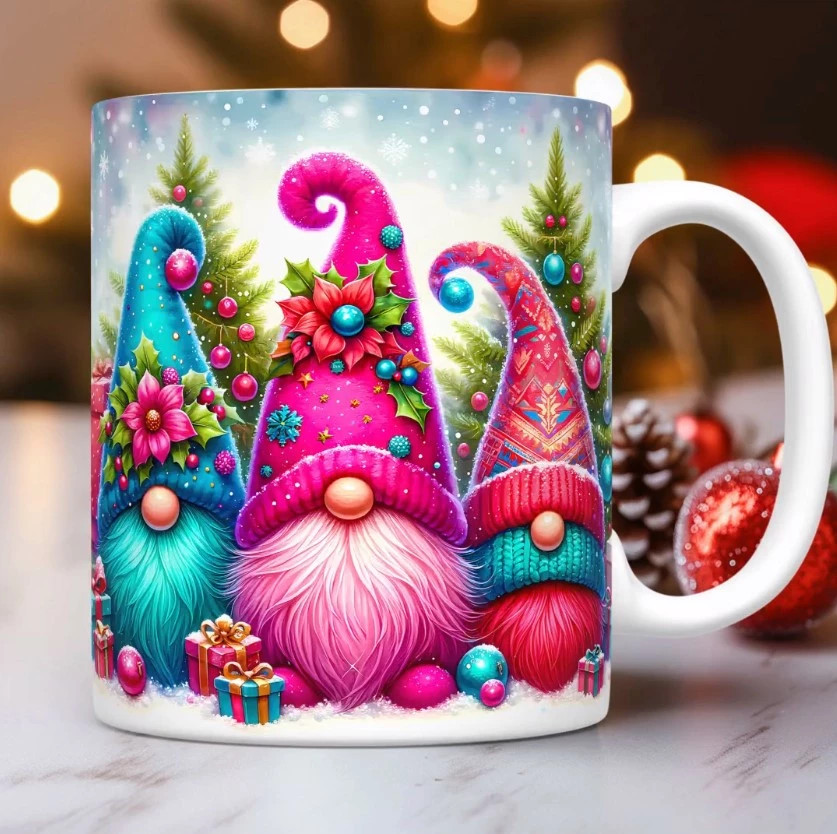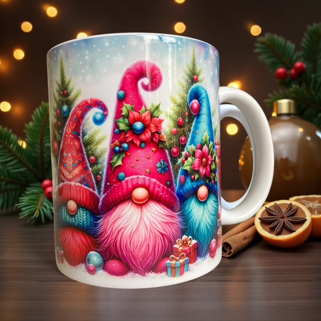 Vidám kerámia bögre karácsonyi motívumokkal és manó családdal. A bögre körbe díszített. Méret 3 dl.