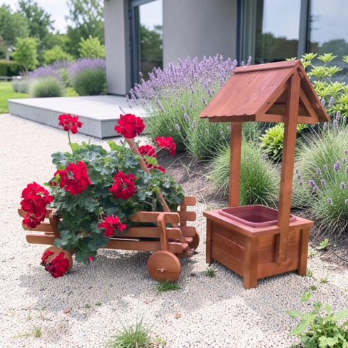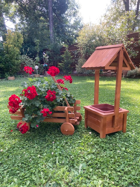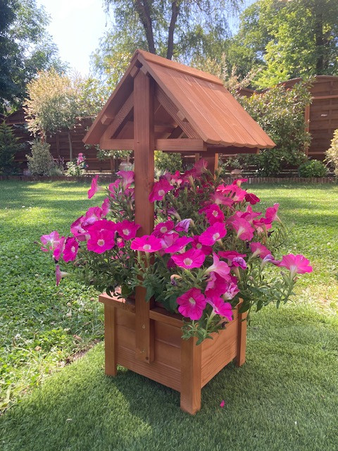 - 1 db Fából készült dekoratív kút kivehető műanyag ültető betéttel. 79 cm magas, 29*29 cm széles. Összeszerelve szállítjuk. Anyaga fa, lazúrral fújva. Szín: világos barna