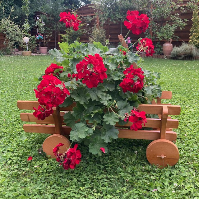 - 1 db Dekoratív fa virágtartó szekér. Méret: 69*30 cm, 27 cm magas. Anyaga fa, lazúrral fújva. Összeszerelve szállítjuk. Szín: világos barna