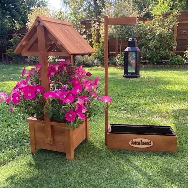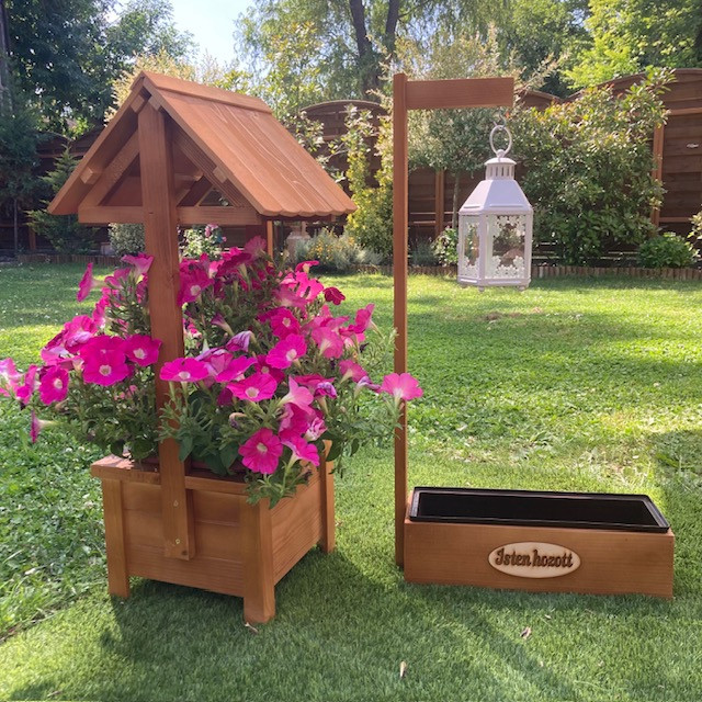 - 1 db Fából készült dekoratív kút kivehető műanyag ültető betéttel. 79 cm magas, 29*29 cm széles. Összeszerelve szállítjuk. Anyaga fa, lazúrral fújva. Szín: világos barna