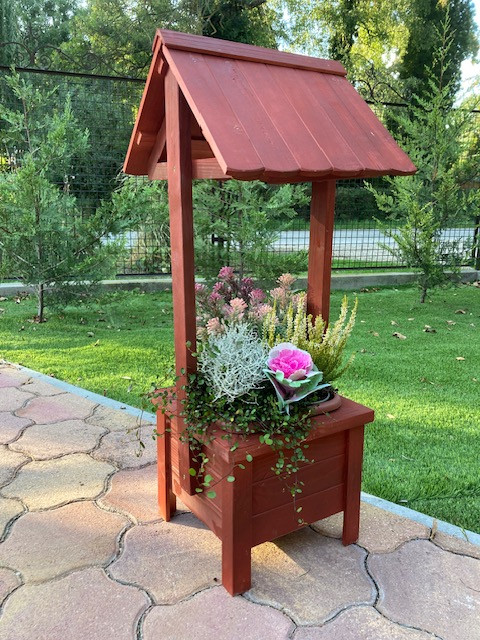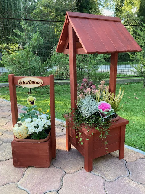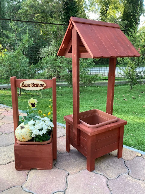 - 1 db Fából készült dekoratív kút kivehető műanyag ültető betéttel. 79 cm magas, 29*29 cm széles. Összeszerelve szállítjuk. Anyaga fa, lazúrral fújva. Szín: világos barna