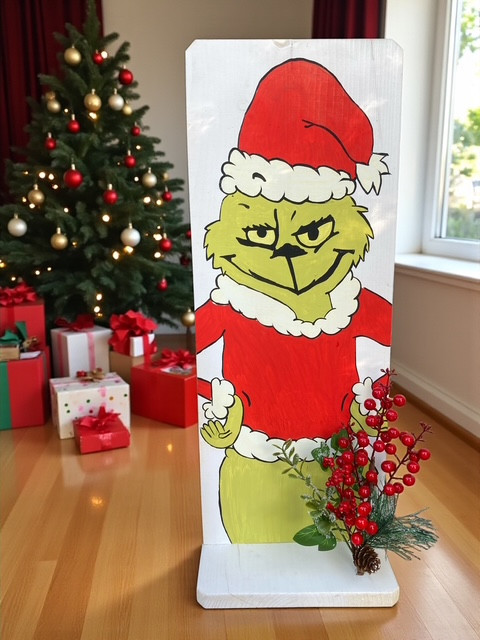 Ha szereted a karácsony vidám, kicsit csibészes oldalát, ez a kézzel festett fa Grincs figura garantáltan feldobja a hangulatot!