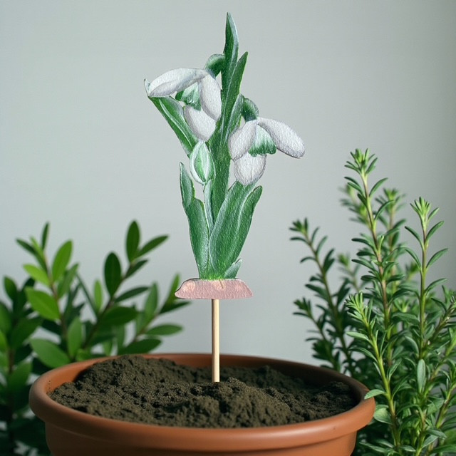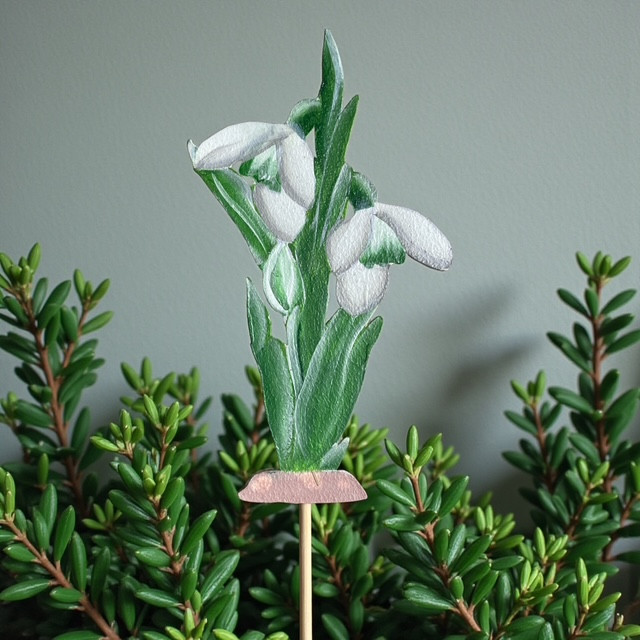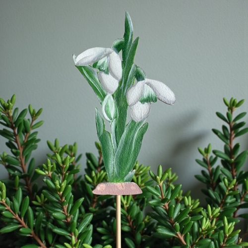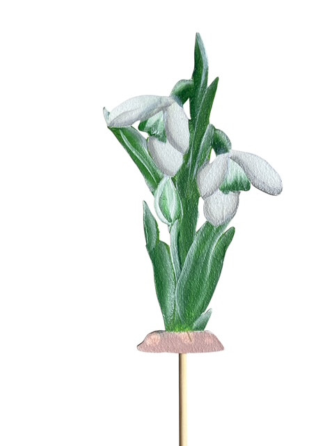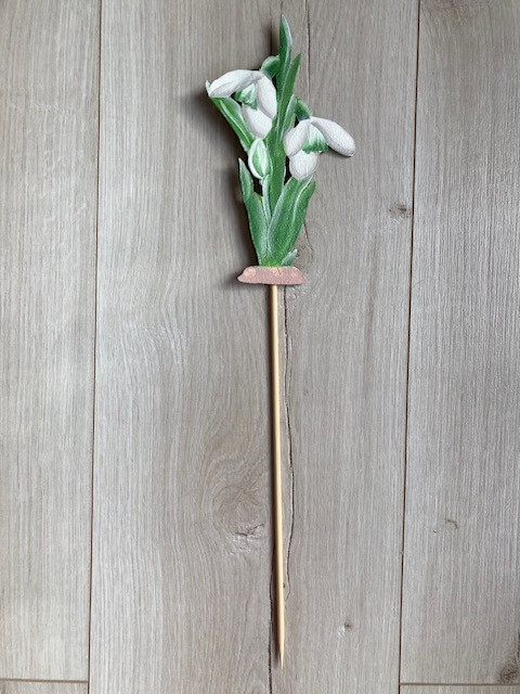 Különleges, kézzel festett hóvirág pálcás dekoráció. Virágcserepeket, balkon ládákat, virágládákat lehet díszíteni vele, vagy felhasználható bármely lakásdekoráció készítéséhez.Méret: 16*9,5 cm. Pálcás szár kb +20 cm.