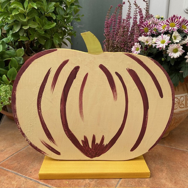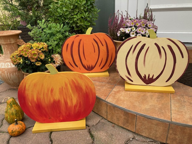 Exclusive őszi dekoráció, nagy méretű halloween tök dekoráció.A fából készült figurák fa talpuknak köszönhetően stabilan állnak.