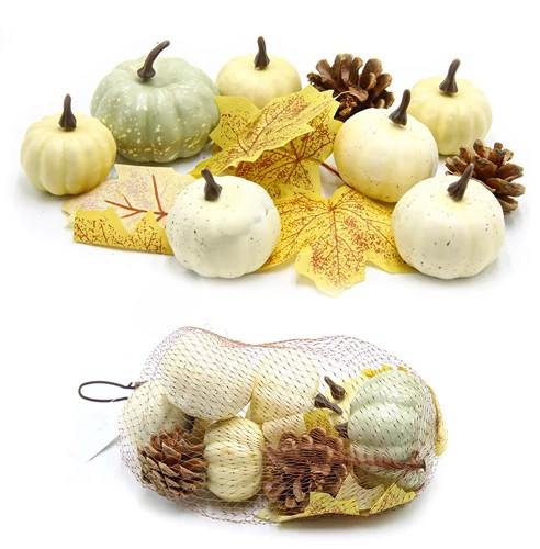 Őszi dekorációs csomag, 13 db-os. A csomag tartalma: tök 7 db; fenyő toboz 2 db; levelek 4 db. Anyaga: műanyag.