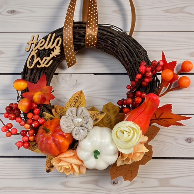 Vidám őszi ajtódísz vessző alapon tökökkel, bogyókkal, virágokkal, levelekkel díszítve. Átmérő kb. 20 cm.