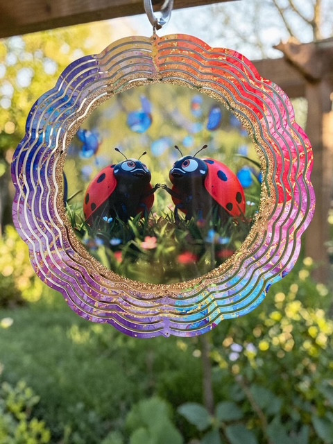 Kerti szélforgó vidám motívumokkal mindkét oldalán díszítve. Az akasztónak köszönhetően könnyen elhelyezhetjük a terasz, erkély, vagy a kert bármely részén. Fém anyagának köszönhetően igen tartósak, időtállóak.