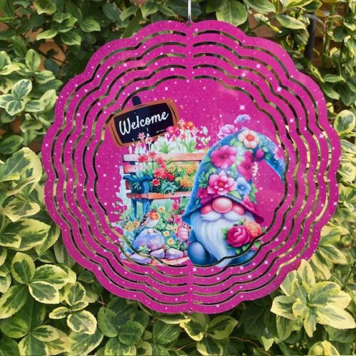 Kerti szélforgó manóval és virágokkal mindkét oldalán díszítve. Az akasztónak köszönhetően könnyen elhelyezhetjük a terasz, erkély, vagy a kert bármely részén. Fém anyagának köszönhetően igen tartósak, időtállóak.