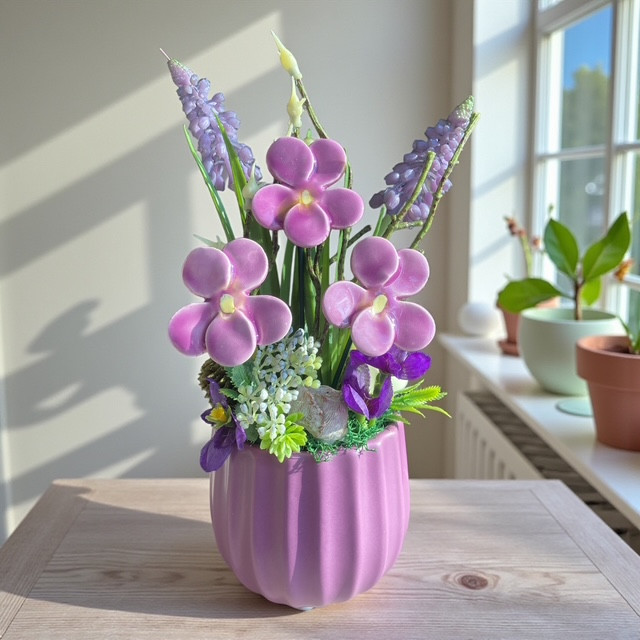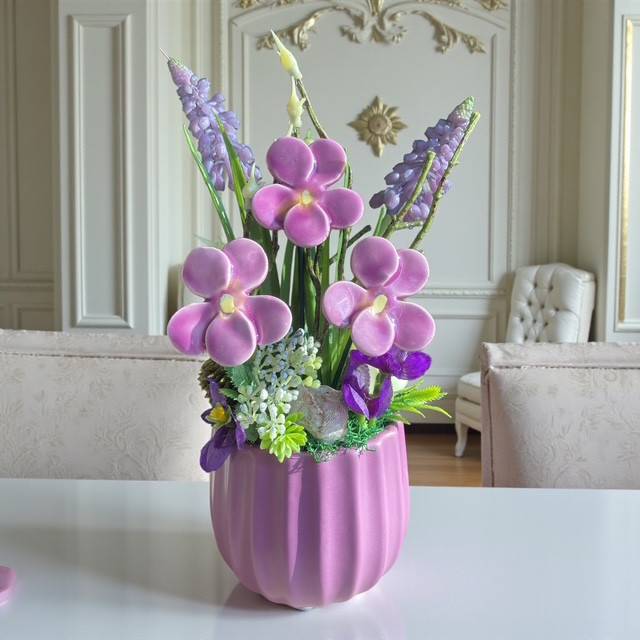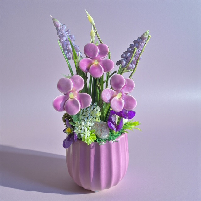 Elegáns tavaszi asztaldísz 3 szál kerámia ibolyával, művirágokkal, termésekkel és élethű gyöngyikével díszítve, bordázott lila kaspóban.
