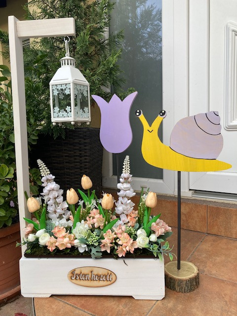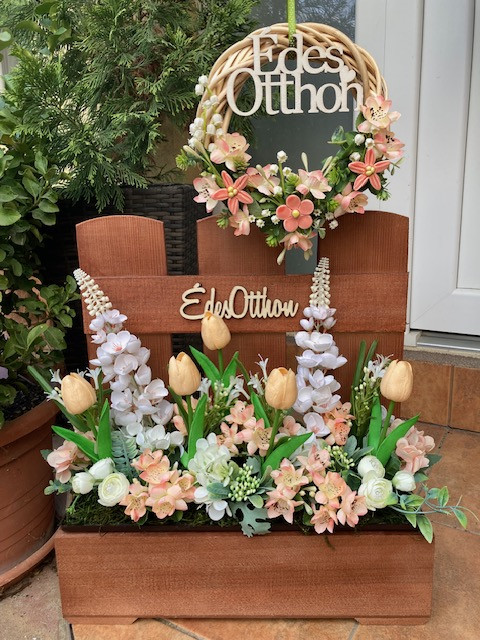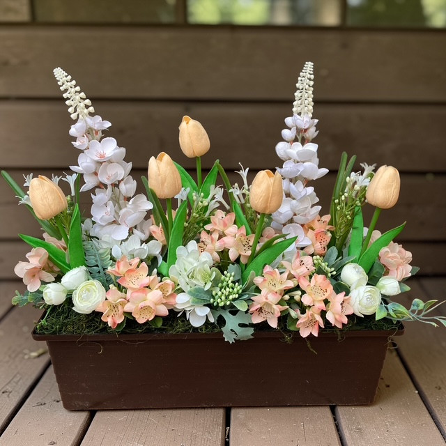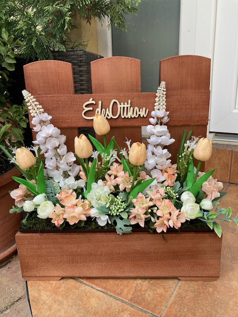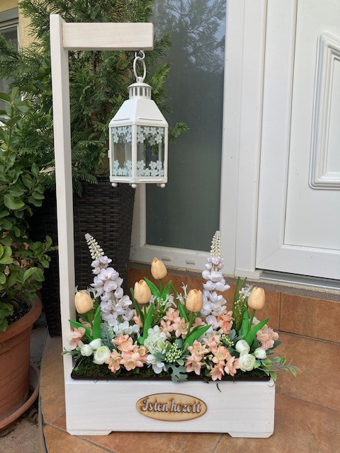 Virágláda betét gyönyörű tavaszi művirágokkal gazdagon díszítve. Kb 39 cm magas. A műanyag betét mérete 40*15 cm.Élő növényeket nem tartalmaz. Lámpás, rácsos, táblás, malom virágládáinkhoz, valamint a virágtartó padhoz kompatibilis.Az üdvözlő virágládát külön meg kell rendelni, az nem része az árnak!