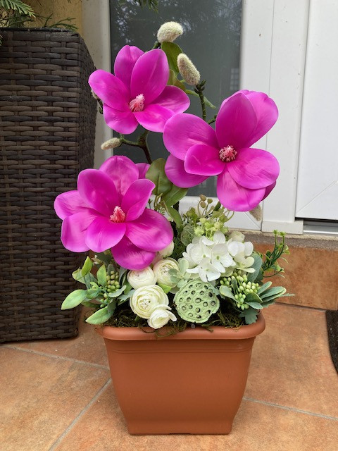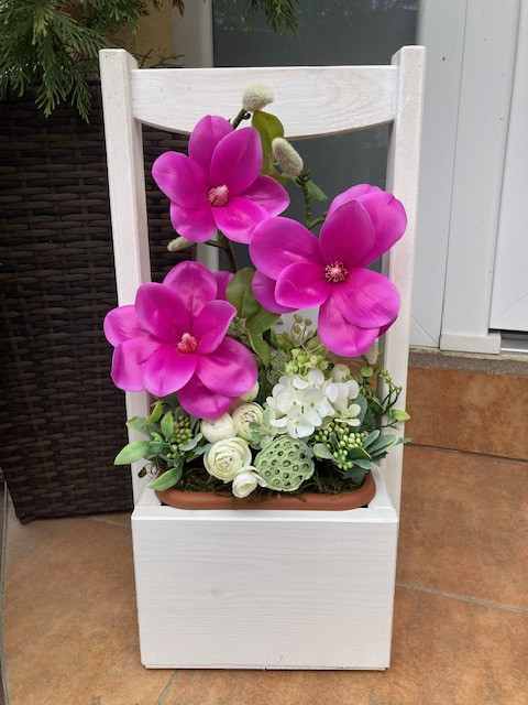 Tavaszi virágláda betét magnóliáva és egyéb művirágokkal, valamint termésekkel díszítve, műanyag ládában.Élő növényeket nem tartalmaz. Betét mérete: 21*21 cm. Kb. 45 cm magas.Kocka aljú virágládánkhoz kompatibilis. A fa virágláda nem része az árnak, azt külön meg kell vásárolni!