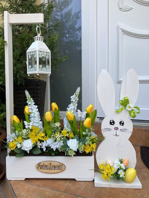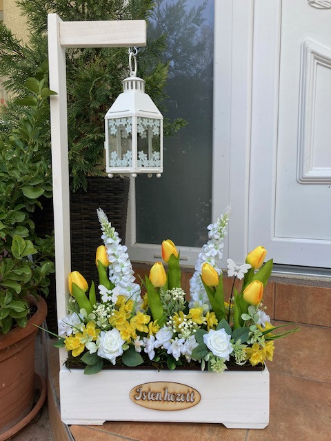 Virágláda betét gyönyörű tavaszi művirágokkal, tulipánnal, nárcisszal gazdagon díszítve. Kb 45 cm magas.A műanyag betét mérete 40*15 cm.Élő növényeket nem tartalmaz.Lámpás, rácsos, táblás, malom virágládáinkhoz, valamint a virágtartó padhoz kompatibilis. Ajtódísz is rendelhető hozzá.Az üdvözlő virágládát külön meg kell rendelni, az nem része az árnak!