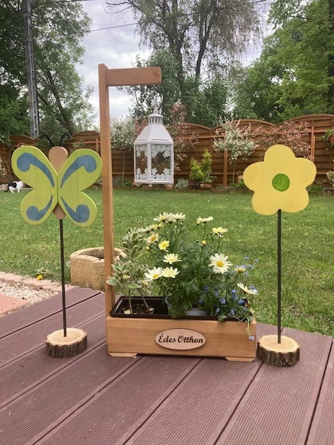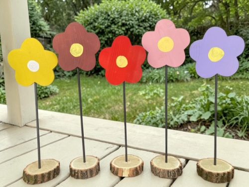 Fából készült színes virágok fa talpon, fém szárral.