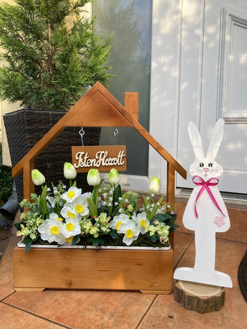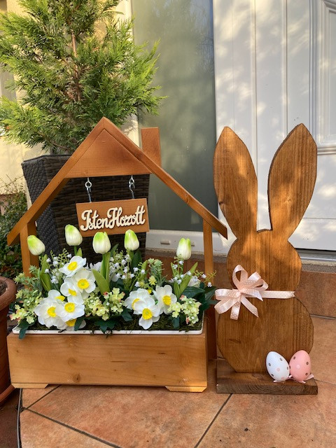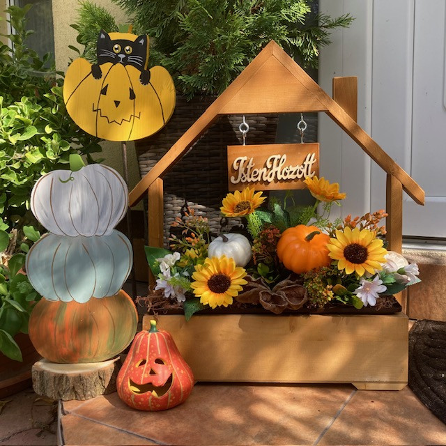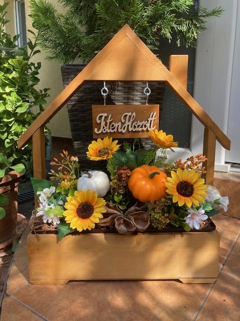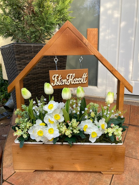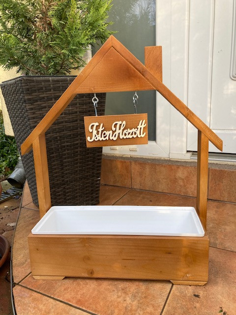 Fa üdvözlő virágláda kivehető műanyag ültető betéttel (40 cm), táblás felirattal. Méret: 57 cm magas, 51 cm széles.