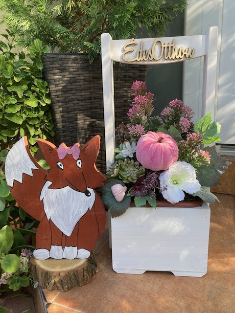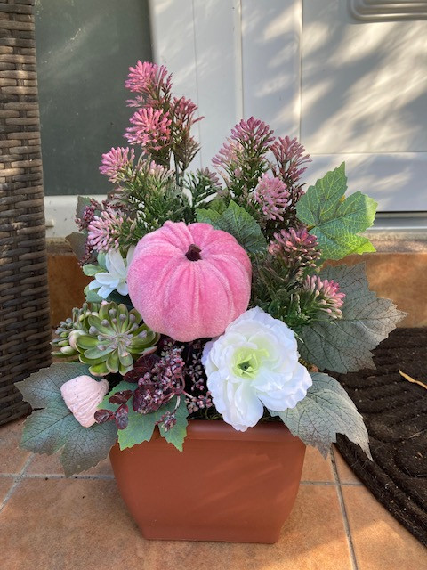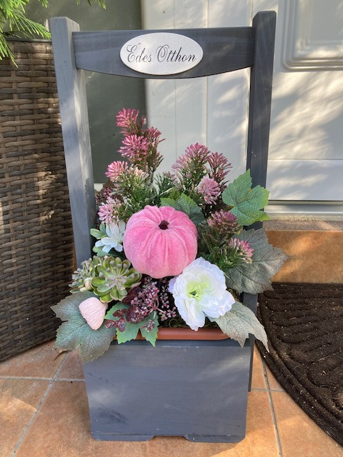 Őszi virágláda betét különleges műnövényekkel, rózsaszín bársony tökkel díszítve, műanyag ládában.Élő növényeket nem tartalmaz. Betét mérete: 21*21 cm. Kb. 35 cm magas.Kocka aljú virágládánkhoz kompatibilis.A fa virágláda nem része az árnak, azt külön meg kell vásárolni!