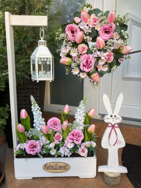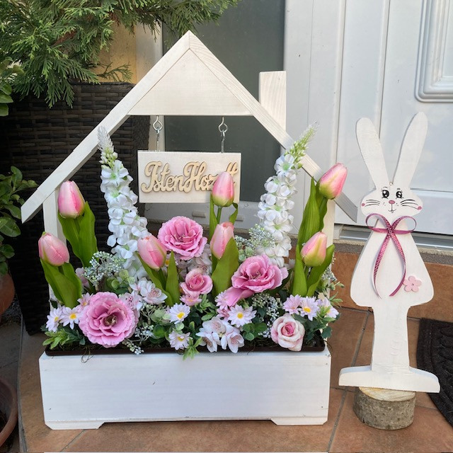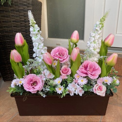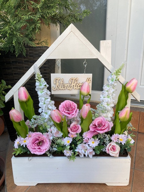 Virágláda betét gyönyörű tavaszi művirágokkal gazdagon díszítve. Kb 45 cm magas.A műanyag betét mérete 40*15 cm. Ajtódísszel is rendelhető!Élő növényeket nem tartalmaz. Lámpás, rácsos, táblás, malom virágládáinkhoz, valamint a virágtartó padhoz kompatibilis.Az üdvözlő virágládát külön meg kell rendelni, az nem része az árnak!