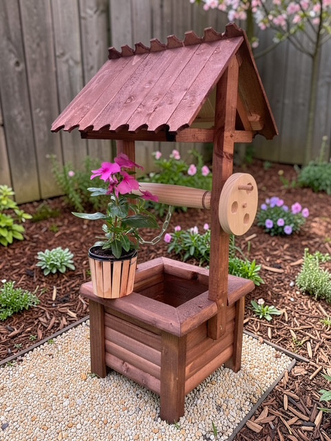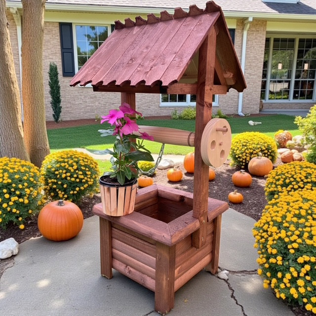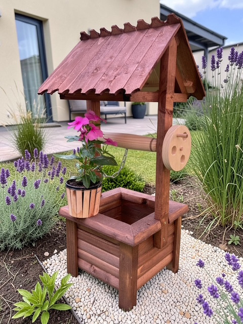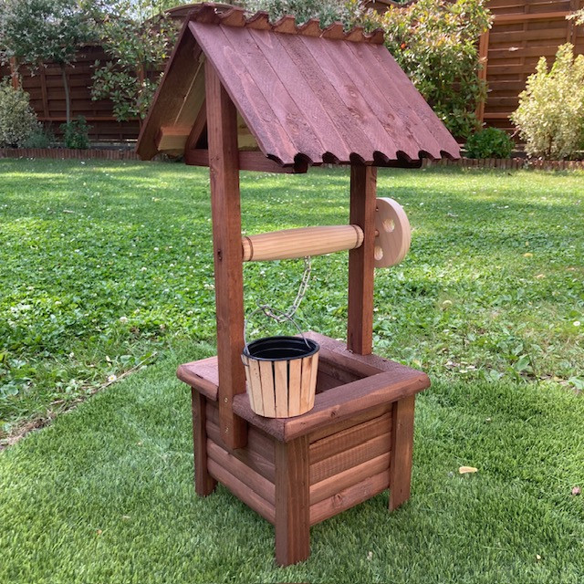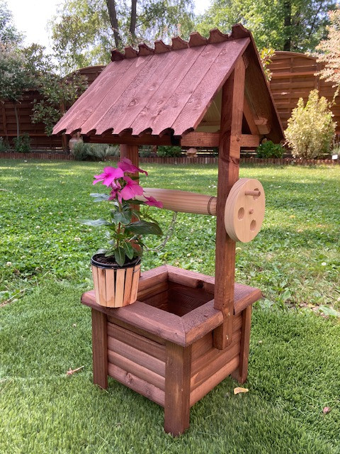 Fából készült dekoratív kerekes kút. 66 cm magas, 31*30 cm széles. Összeszerelve szállítjuk. Anyaga fenyő, lazúrral kezelve. Szín: barna