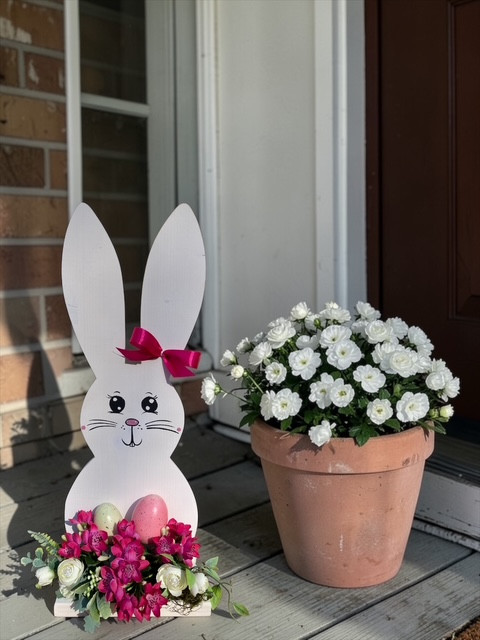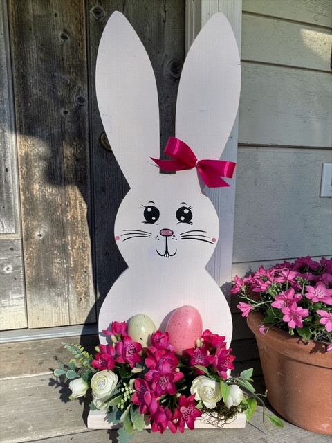 Fából készült nagy méretű nyuszi figura művirágokkal, szalaggal és tojásokkal díszítve. Méret: 52*20 cm.