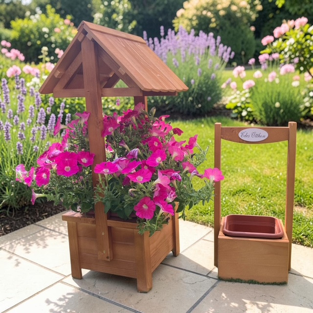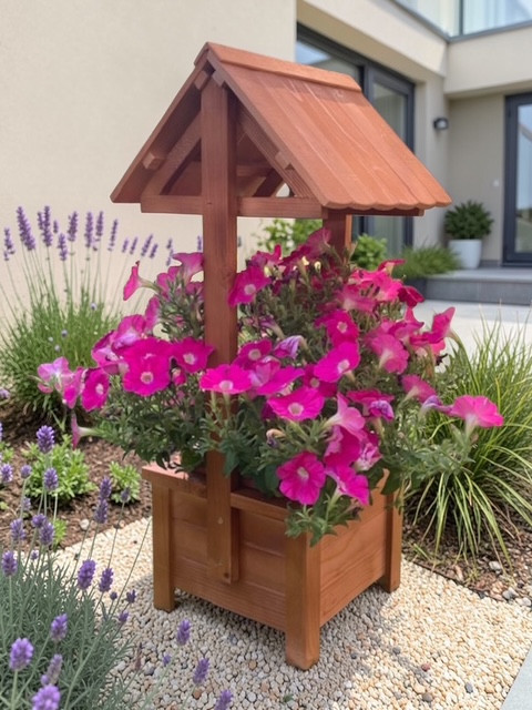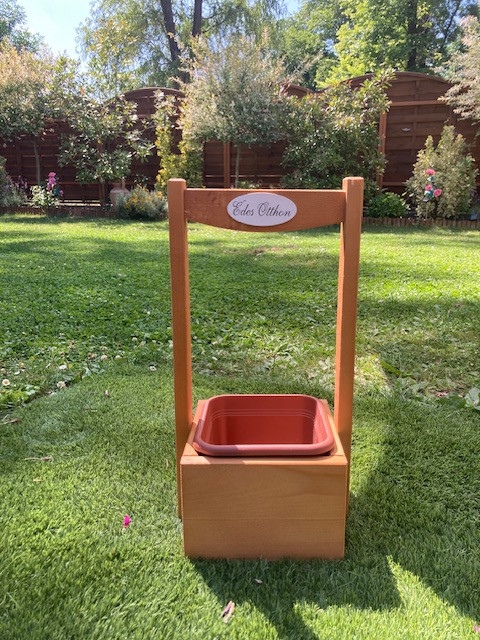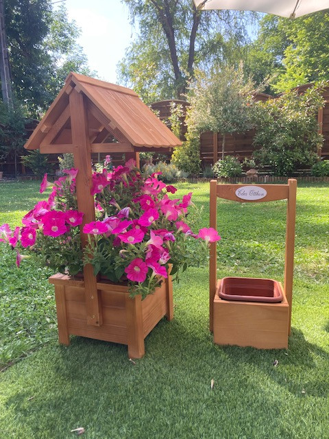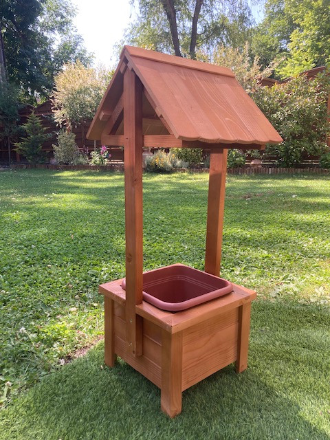 - 1 db Fából készült dekoratív kút kivehető műanyag ültető betéttel. 79 cm magas, 29*29 cm széles. Összeszerelve szállítjuk. Anyaga fa, lazúrral fújva. Szín: világos barna